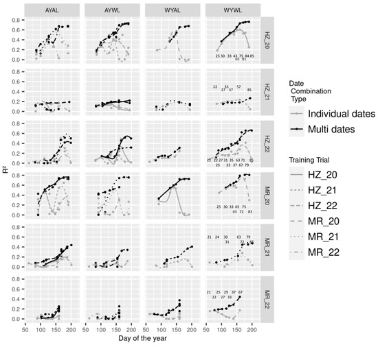 Multi-date models include data from two up to all measurement dates, depending on the number of matched dates between train and test datasets. Dates were incrementally added in temporal order. Scatterplots in Figure S2 depict exemplary WYAL model predictions for individual-date models (first row in (a), (b) and (c), respectively, and multi-date models, second row, respectively). The best R2-values from all multi-date models are compared to those from individual-date models from all trial combinations (Table 2). In all except two train*test set combinations, the best predictions from multi-date models were higher than those from individual-date models (Table 2). The advantage of best multi-date models did not show particular patterns but tended to be relatively stronger in some of the across-trials combinations. In 2021, irrespective of the training trial, improvements were pronounced in MR_21, but marginal in HZ_21.