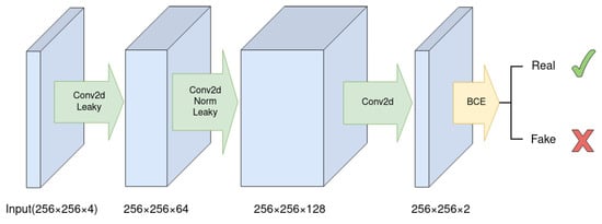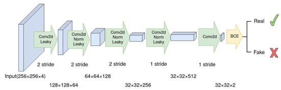 The discriminator should be neither too strong nor too weak with respect to the generator. If the discriminator is too weak, the generator can easily fool it, possibly leading to an unrealistic NIR band. On the other hand, if the discriminator is too powerful, the generator might not pass its scrutiny. There are various options available for the discriminator, depending on the intended purpose. One choice is the Markovian discriminator, also known as PatchGAN [15], as shown in Figure 2. This discriminator classifies whether a patch of size in the input image is real or fake and averages all the patches in the image. It consists of several blocks of 2D convolution, batch normalization, and LeakyReLU layers, with a stride of 2 for all convolutions, except for the last two convolutions. The PatchGAN can be considered a form of texture loss, as it focuses on the local structure of the image.