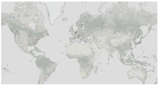 To validate the method, we used the SEN12MS dataset, which is based on the Sentinel-1 and Sentinel-2 datasets [50]. The Sentinel-2 data from the SEN12MS dataset are level 1-C top of atmosphere (TOA) reflectance products. The TOA reflectance is the digital number (DN) divided by 10,000. This data format saves more memory compared with using the floating point format. It should be noted that this dataset is not atmospherically corrected. A cloud filter was applied during the data selection process to make sure the effect of clouds was minimized. The imagery has in total 13 bands with the spatial resolution ranging from 10 m to 60 m. In our experiment, we selected the red (R), green (G), blue (B) and near-infrared (NIR) bands with 10 m resolution for the experiment. Details of the band information can be found in Table 1. The dataset encompasses diverse areas, including desert, field, forests, urban areas and water bodies. The images in SEN12MS are distributed globally with varying longitudes and latitudes, and is categorised by seasons, as illustrated in Figure 4. The dataset is categorized into the four meteorological seasons of the northern hemisphere: winter (1 December 2016 to 28 February 2017), spring (1 March 2017 to 30 May 2017), summer (1 June 2017 to 31 August 2017), and fall (1 September 2017 to 30 November 2017).