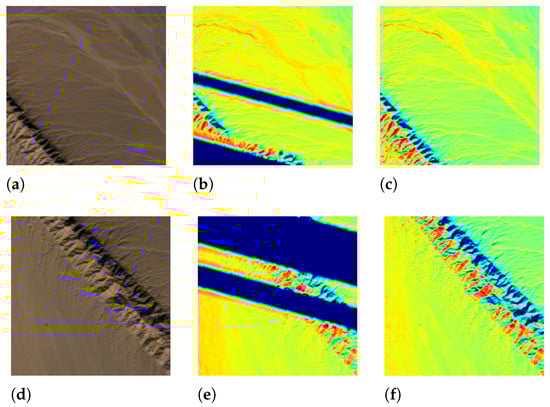 Selected example patches from Sentinel-2 dataset (a,d). Artifacts can be seen in the real NIR band (b,e). The corrupted pixels in the NIR band are recovered by the model (c,f).