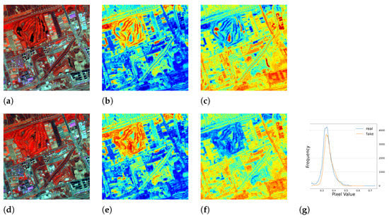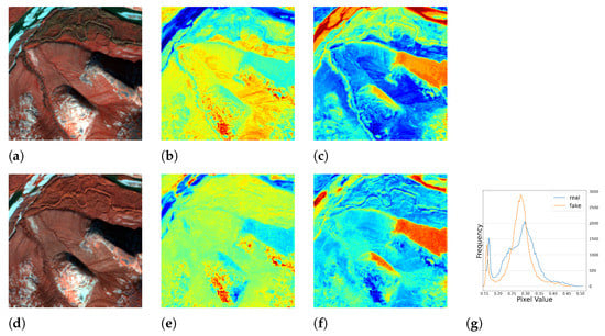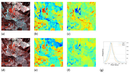 The full season result of cGAN-PixelD with robust loss, autumn. The ROI is located in Qararnaz, Iraq. (a) pseudo color image with the real NIR band; (b) NDVI from the real NIR band; (c) NDWI from the real NIR band; (d) pseudo color image with the fake NIR band; (e) NDVI from the fake NIR band; (f) NDWI from the fake NIR band; (g) histogram plot of the real and fake NIR bands.