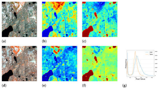 The single season result of cGAN-PixelD with robust loss. The ROI is located in the northeast of Russia. (a) pseudo color image with the real NIR band; (b) NDVI from the real NIR band; (c) NDWI from the real NIR band; (d) pseudo color image with the fake NIR band; (e) NDVI from the fake NIR band; (f) NDWI from the fake NIR band; (g) histogram plot of the real and fake NIR bands.