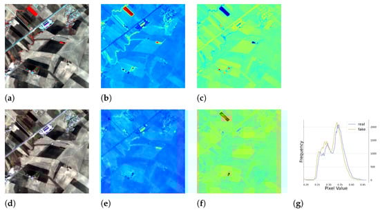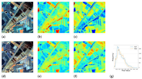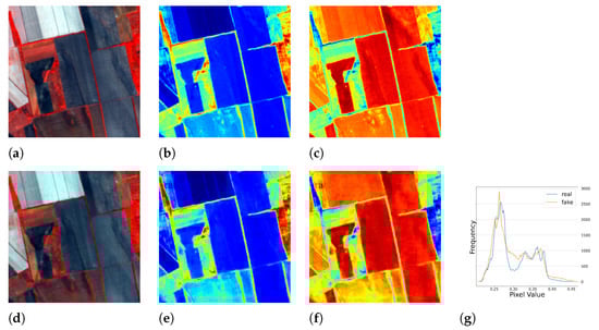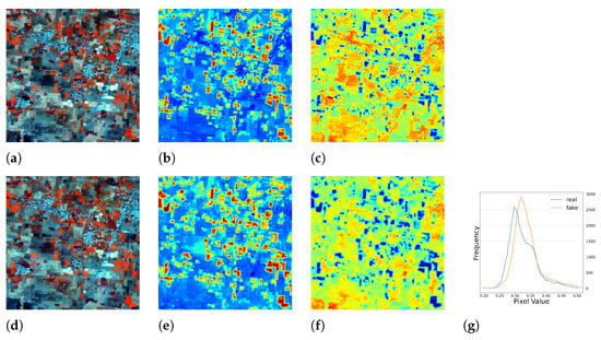 The full season result of cGAN-PixelD with robust loss, summer. The ROI is located in Novosavyts’ke, Ukraine, near the border with Moldova. (a) pseudo color image with the real NIR band; (b) NDVI from the real NIR band; (c) NDWI from the real NIR band; (d) pseudo color image with the fake NIR band; (e) NDVI from the fake NIR band; (f) NDWI from the fake NIR band; (g) histogram plot of the real and fake NIR bands.