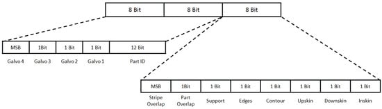 The research was conducted in the additive metal printing research lab at the Technical University of Applied Sciences Würzburg-Schweinfurt, where a 3D printer (EOS M290) is available and stores powder bed images from build jobs in a database. The grain size of the metal powder typically used ranges from 10 to 25 μm, and the maximum part size is within a cube with an edge length of 250 mm. The approach focuses on using the black and white camera images from the built-in device, which captures images with a resolution of 1280 × 1024 px and a field of view of the whole powder bed. The camera is connected via USB and the exposure is triggered every time the melting of a layer has finished. Geometrical corrections and cropping were performed to select the building platform as the region of interest. One advantage of the built-in equipment and stored images is that, for each printed layer, a reference image is available that contains different information encoded in a specific scheme. Every pixel of this single-channel mask has 24 bits, which encode information about the desired part process features shown in Figure 1 as a reference (Note: To access this information, a specific license is needed.).