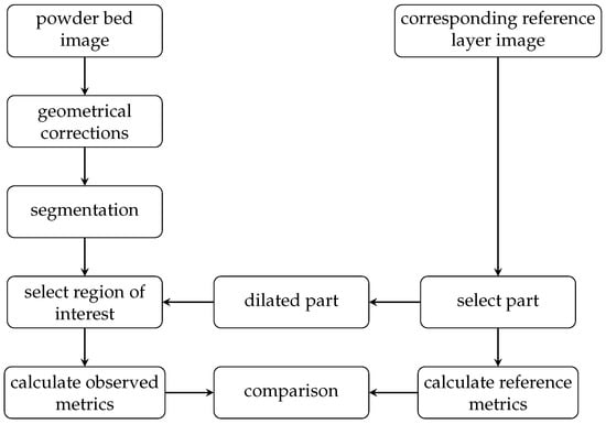 The basic idea of the monitoring approach is not to detect or classify defects. Instead, it is about detecting deviations from the planned process and, therefore, being able to set thresholds on geometrical metrics, such as positions, areas, and area centroids. This approach requires a reference layer with at least the part identification and the location of the melted areas (pixels). This information is provided as described earlier. On the other hand, an observed layer is needed, which represents the actually produced layer. This actual layer is calculated based on an image captured by the powder bed camera. A flowchart for the monitoring approach is shown in Figure 2.
