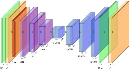 The final step is training the neural network, originally described in [17] and extended in [18] (see Figure 4 and Appendix A). The resolution of 750 × 750 px can only be halved once until the resolution is an odd number and cannot be halved again. Therefore, the first layer, zero padding, is added to obtain a resolution of 752 × 752 px. In the last layer, these zeros are cropped to match the target resolution.
