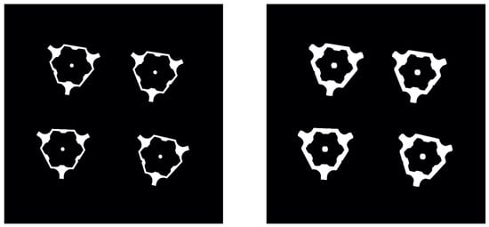 If a print job has multiple components (parts), the corresponding region in the image has to be determined. The pixels belonging to one part in the reference layer can be derived from bits 5 to 16 (see Figure 1) and are set to 1, while all other pixels are set to 0. To extract the corresponding pixels from the segmentation image, the areas from the reference layer are dilated with a 7 × 7 kernel (see Figure 5) [20]. This approach assumes that pixels classified as melted metal with a tolerance of 3 pixels belong to the same part. With the given resolution of 3 pixels per millimeter, this assumption means that pixels classified as melted metal belong to the same part with a maximum tolerance of one millimeter. In the observed layer image, only the pixels that are also 1 in the dilated reference layer are kept as 1. Using a rectangular bounding box to identify the part is not sufficient because the box can intersect with other parts on the building plane. Therefore, annotating the pixels classified as melted metal with the correct corresponding part identification is necessary to use the predicted melted part in subsequent calculations.