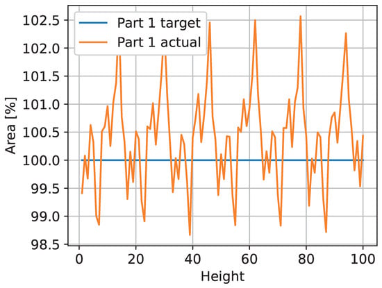 Using the observed layer image from Section 3.3, the area of the part can be calculated using Equation (1). However, actual and target areas may have a systematic deviation due to imperfect optical corrections for the geometrical distortions. To compensate for this systematic bias, the deviation factor of the first 10 layers is determined and then multiplied to all predicted values. This calculation assumes that at the beginning of the print job, the first melted layers will perfectly match the reference layers because thermal distortions or other process defects will not occur at the very beginning.