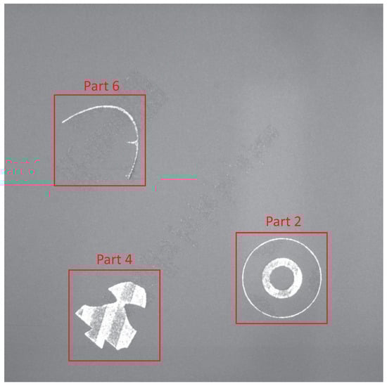 The chosen print job highlighted several limitations of the described methods. One of them is the relationship between the dimensions of thin parts and the theoretical image resolution. The thin-walled structure of part 6 and the outer circle of part 2 are examples of this. The smallest part thickness is between 1 and 2 mm, resulting in only 3–5 pixels in width, which can lead to incorrect segmentation or less precise position results. Using a camera with a higher resolution could be a solution to this. Alternatively, another image-capturing device, such as a line camera attached to the recoating device, could also increase resolution and precision. In addition, retraining the neural network with new images, especially those with challenging conditions for segmentation, would be a promising next step.
