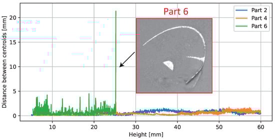 Figure 11 shows the distances between the area centroids of the parts. The centroid distances for parts 2 and 4 are below 1.5 mm for all layers. The observed distances in the area centroids for part 6 show several peaks and a higher standard deviation compared to the other parts. The highest observable peak with distances of more than 5 mm is located at the building level after part 6 was damaged due to a collision with a recoater.