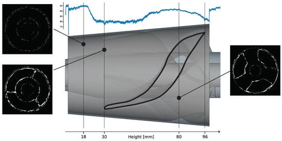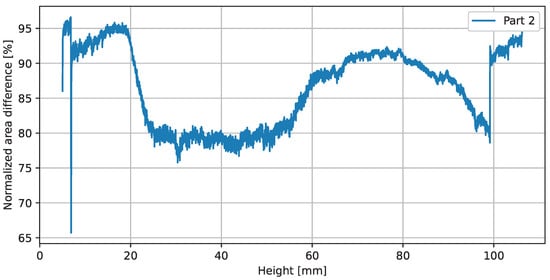 A side view of part 2 is shown in the middle of Figure 12. It consists of two thin-walled concentric hollow cones, which are interconnected in the build-height range from 30 to 96 mm by a screwed impeller structure. In addition to the shown CAD representation of the part at the top of Figure 13, the normalized area difference (refer to Section 3.4) is plotted over the building height. At three specific positions, images generated with the xor operation on the observed layer image and the reference layer image are shown to illustrate the deviations. An ideal congruent layer image would have a value of 100% match, indicating that no pixel differs between the reference layer image and the observed layer image. Thus, any value below 100% indicates a difference or misclassified pixels. Comparing this result with the geometrical definition of the manufactured part suggests that there is a thermal deformation in the build height region (30 to 96 mm) where the concentric cylinders are connected by solid metal with a varying cross-sectional area (refer to the vertical lines in Figure 13). Based on this calculated metric, it is not possible to directly derive the absolute value of the deviation. Therefore, a supervised set threshold is required to define a valid range. Investigations to compare the graph with tactile-measured geometrical deviations have not yet been performed and will be part of future work.