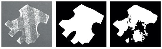 The straightforward non-parametric methods for segmentation are not sufficient in their results. The tests and applications of such methods were carried out on images where the melted areas perfectly matched the reference layers. A solution using only OpenCV-provided methods was tested but proved to be insufficient. In Figure 3, an image of an example layer is displayed on the left. The second image from the left is the corresponding mask calculated from the reference image. In the middle and second-to-right pictures, the segmentations using the OpenCV Otsu’s and adaptive thresholding methods are displayed, respectively. In comparison, the rightmost image shows the segmentation using a specifically trained Xception neural network.