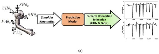 In the present study, we have also focused on a synergistic method for intuitive control of the prosthetic elbow joint for transhumeral amputees. The majority of previous such motion-based approaches using residual limb motion rely on ANNs [,] to identify and model the shoulder–elbow kinematic relationship, as inductive learning (IL) applied in [] and radial basis function networks (RBFNs) used in [,]. The ANN is typically trained to map the shoulder kinematics (provided as input) to the elbow or forearm kinematics (provided as output) through supervised learning. To the best of our knowledge, in such previous approaches, no prior synergistic information is extracted from the motion data used for training the ANNs. This type of approach, in simplistic terms, can be represented as in Figure 1a and is hereafter referred to as “direct estimation”. However, the direct estimation method has a limitation due to its sensitivity to inter-individual variability. As a result, the performance of the model drops significantly when applied across multiple users, making it less suitable for generalization and transferability.