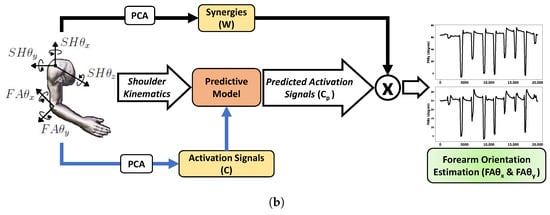 Illustration of the idea of this study: (a) a simplistic representation of direct estimation method; (b) the proposed synergy-space neural network method. Here, , , and are the shoulder kinematics, and and represent the forearm orientations. The PCA blocks symbolize the process of synergy extraction, where W represents the synergistic components and C is the corresponding activation signal matrix. The predictive model is the trained RNN that outputs the predicted activation signals , with the cross-operator representing the matrix multiplication of the incoming values.