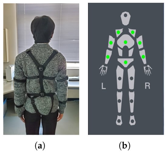 Neuron pro sensor placements for capturing the required motion data: (a) subjects wearing neuron sensors; (b) green spots marking the placements of the sensors for the upper body mode of neuron pro because only arm movement data are required.