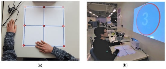 Experimental setup for the target reaching tasks: (a) target grid with a subject’s right hand at the start point; (b) complete experimental setup for the target reaching tasks.