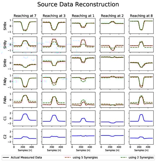 The first 5 rows represent the shoulder and elbow joints’ angular values normalized between and . It comprises the source data (solid black curves) of subject one and its reconstructions using all five synergies (red dotted curves) and only two synergies (green dotted curves). The last two rows represent the corresponding activation signals C (C1 and C2 in the case of two synergies).