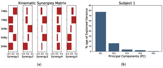 Example of the kinematic synergies of subject 1. (a) The spatial synergies extracted from the training data. The notations , , , , and indicate the axis of the degree of freedom. (b) Bar plot showing the importance of each principal component in explaining the variance in the source data.