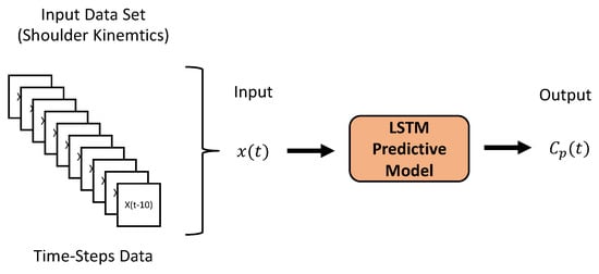 Lastly, to avoid the overfitting problem, a dropout rate of 10% is used in each layer, whereby 10% of the neurons are dropped randomly. Supervised learning is then carried out, where the neural network develops the regression model based on the input–output pairs. As for the training data, at a single time step, we can apply a total of six inputs to the model: the , , and angle of the shoulder joint and their respective derivatives , , and (i.e., shoulder joint angular velocities). It is also possible to input multiple time-step data to the LSTM model at a time using the last few time-step data to predict the output for the current time step. This can improve the estimation accuracy at the cost of increasing calculations. We used the ten previous time-step data as inputs to the model (Figure 6). The model outputs were the activation signals, which in the case of two synergies are and .