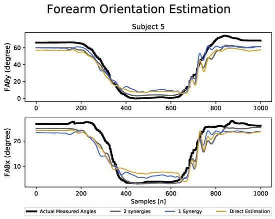 Sample of the joint angular value plots of the actual vs. estimated forearm motions using two synergies, one synergy, and direct estimation learning methodologies for one of the tested scenarios of subject 5.