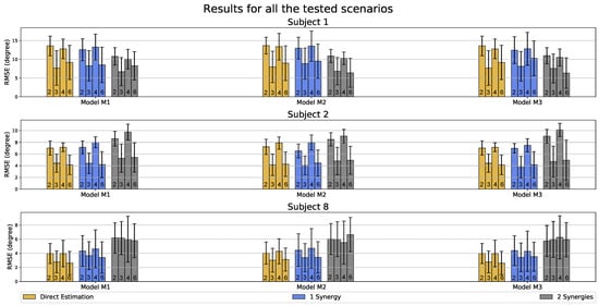 Regarding the minor differences for all the trained scenarios for each subject in the study, we obtained three general result types. First, similar to subject 1 (Figure 8), the synergy-space method (using 2 synergies) produced the lowest RMSE values with an overall RMSE and standard deviation value of and , respectively, for all the tested scenarios. Second, similar to subject 2 (Figure 8), we obtained almost similar RMSE values having some variations from an overall RMSE and standard deviation value of and , respectively, for all the learning methodologies. Lastly, similar to subject 8 (Figure 8), the direct estimation method had the lowest RMSE values with an overall RMSE and standard deviation value of and , respectively, for all the tested scenarios. We only selected the scenarios trained using model M2 for further analyses, i.e., with two hidden LSTM layers, as it produced the best overall results.