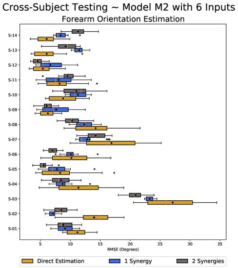 The evaluations were performed by calculating the RMSE values to compare the estimated motions with the actual measured values. For the cross-subject analysis, we used model M2 with six inputs (i.e., best-case scenario) and model M2 with two inputs (i.e., worst-case scenario). The ANOVA was then performed to statistically verify the difference between the cross-subject results based on the synergy-space and direct estimation approaches.