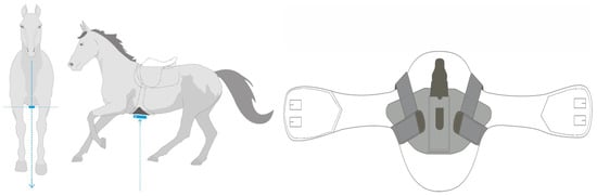 All measurement trials were performed in a temporary tent arena 20 × 60 m (Figure 1). Before every measurement trial, each horse was fitted with the Alogo Move Pro sensor (Alogo Swiss Technology, Renens, Switzerland) and the optical markers used by the OMC system (Qualisys AB, Gothenburg, Sweden). The sensor was placed in a custom-made pocket on the protective plate on the saddle girth. It did not hinder movement and weighed only 127 g (Figure 1). Two drawings in Figure 2 show the positioning and mounting of the sensor. Reflective markers were attached using double adhesive tape on the protective plate, over to the fetlock joints on brush boots, on the saddle, on the pelvis, on ribs 15 and 16 (16 and 18 for one horse), on both sides of the belly, and the head (Figure 1). The 24 OMC (Oqus 7+) cameras were rigged on aluminum rails suspended 3 m above the floor and aimed to cover an area of 10 × 20 m in the center of the arena. OMC system sampled positions on the x, y, and z axes at 100 Hz. Alogo Move Pro sampled acceleration on the x, y, and z axes at 100 Hz. For both systems, position, and speed were derived from these measures. Based on these samples, Alogo Move Pro provided a temporal segment corresponding to the strides and jumps. On each segment, parameters Zmax, lhorz, and vhorz were computed by both systems, thus turning the temporal data comparison into a stride comparison. The temporal aspect was implicitly embedded in the stride number.