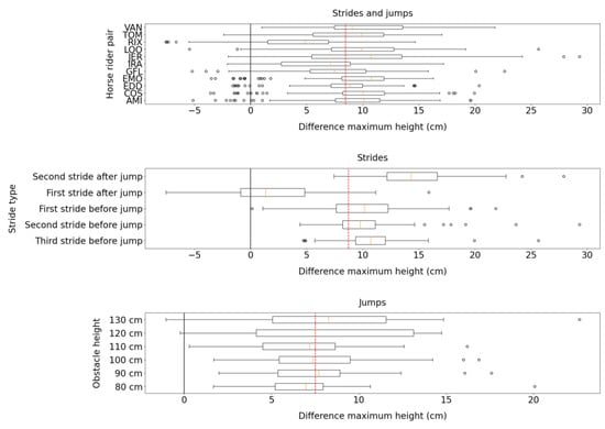 Box plots for the difference in the maximum height (Zmax) measured by the Alogo Move Pro sensor and the OMC system. The red dashed line indicates the mean difference over categories. Box plots show three splits by HRP, stride type (only for strides), and obstacle height (only for jumps).
