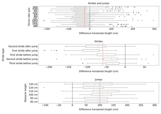 Box plots for the difference in the stride/jump length (lhorz) measured by the Alogo Move Pro sensor and OMC system. The red dashed line indicates the mean difference over categories. Box plots show three splits by HRP, stride type (only for strides), and obstacle height (only for jumps).