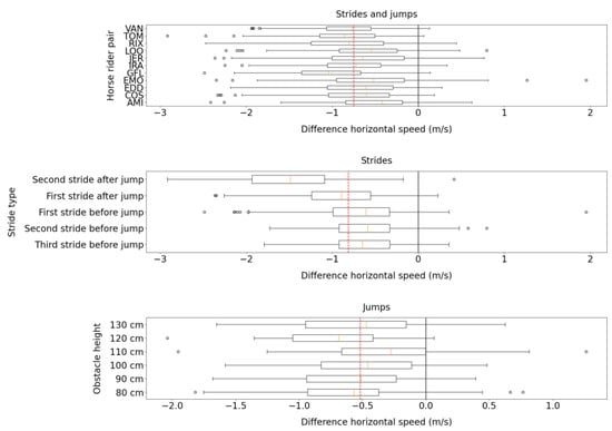 Box plots of the difference of the mean horizontal speed (vhorz) measured by Alogo Move Pro sensor and OMC system. The red dashed line indicates the mean difference over categories. Box plots show three splits by HRP, stride type (only for strides), and obstacle height (only for jumps).