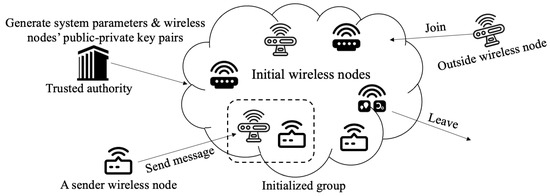 - Receiver non-restriction: Any sender who has known the public group encryption key of a group is allowed to flexibly select its favorable wireless nodes within the group to receive the encrypted message.