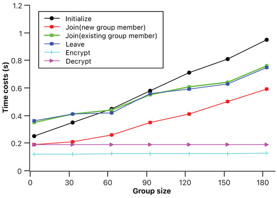 The main contribution of this paper is to formally prove the security of the IBADConBE scheme in [18]. As for the detailed simulations, they can be found in an experimental part of the work published on 2022 WCNC [18]. Therefore, we only described the simulation results regarding the efficiency of the IBADConBE scheme based on the experimental part of the work published on 2022 WCNC. The settings of the simulations are consistent with those in [18]. In particular, the MIRACL library [22] was used to implement each algorithms of the IBADConBE scheme. The BN curve with a 128-bit security level was selected. The simulations were run on a RaspberryPi 3b+ with an ARM Cortex-A53 CPU at a frequency of 1.4 GHz. The group size was set from 3 to 180. Since GlobeSetup and Enrollment were only invoked once, the overall execution time of the IBADConBE scheme is mainly determined by Initialize, Join, Leave, Encrypt and Decrypt algorithms. We note that, under the above settings, the simulation results in this paper are consistent with those in [18]. Hence, in this paper, we only need to briefly describe the simulation results. As shown in Figure 2, when the group size ranges from 3 to 180, Initialize costs from s to s, the running time of Join for the new wireless node ranges from s to s while the running time of Join for each group member is from s to s. We note that the execution time of the above algorithms is largely influenced by the group size. The execution time of Encrypt and Decrypt algorithms slightly increases with the group size. Particularly when the group size is 180, the overall running time of Encrypt and Decrypt is still less than s. This result demonstrates that the IBADConBE scheme can be stably and efficiently implemented, even in large groups.