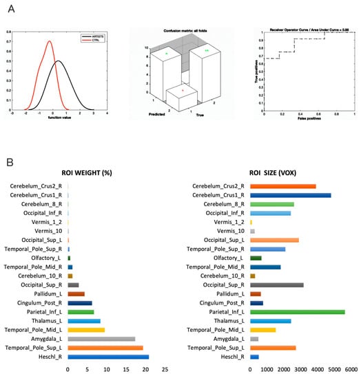 The MKL returned a total and balanced accuracy of 79.17% (p = 0.024), with a class accuracy of 75% for artists and 83.33% for non-artists. The class predictive value was of 81.82% for artists and 76.92% for non-artists, and the AUC was of 88% (Figure 1A). The model performance significantly exceeded the threshold of randomly guessing the labels, thus confirming that the algorithm successfully learned a predictive function [] that can be used to predict new unobserved cases. Although MKL is a whole-brain estimation of the contribution of each of the 116 regions included in the atlas, we focus on the regions explaining at least 1% of the variance. GM regions were identified according to the Automated Anatomical Labeling (AAL) atlas (available on the WFU-PickUp Atlas toolbox of SPM12, []), a manual macroanatomical parcellation of single-subject MNI-template brain consisting of 116 brain regions. Regions with a larger contribution to the model were in the following order of importance: the right Heschl area, the left superior temporal pole, the left amygdala, the left mid-temporal pole, the left thalamus, the left inferior parietal, the right posterior cingulate, the left pallidum, and the right superior occipital areas. Cerebellar regions were also present but played a minimal role (below 1%). See Figure 1 and Figure 2.