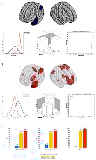 Testing the relevance of the MKL classifier circuit. (A) Drop in performance of the MKL classifier considering the brain features (in gray) minus the brain features of the predictive circuit of the main analysis (in dark blue). The classifier was unable to predict the classes and mislabeled the two groups. (B) Increased performance of the MKL classifier trained only on the brain features of the predictive regions of the main analysis (in red over the transparent brain). This classifier outperformed the original analysis by removing the probable noise provided by the non-relevant brain regions. (C) A comparison of the three models for total accuracy, predictive accuracy, and AUC.
