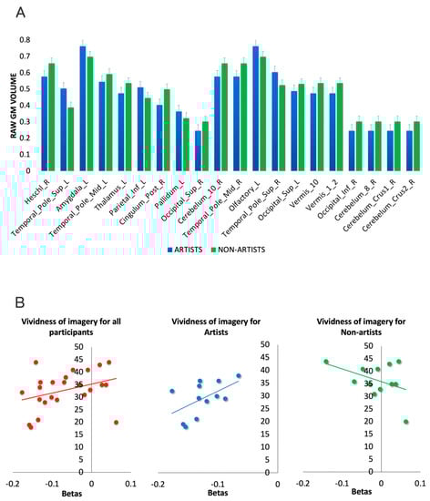 While there are several mental abilities that can differentiate visual artists from non-artists (such as emotional sensitivity, visual memory, motor abilities, etc.), these aspects are beyond the scope of this study; rather, the specific purpose of this study is to determine whether there are structural differences in the brains of professional artists compared to non-artists, and whether these differences can be used to classify individuals as artists or non-artists. To the best of our knowledge, no previous study has examined these structural differences between professional artists and non-artists. Despite some progress in this field [,,,], studies exploring whether differences in brain morphology characterize visual artistic creativity and mental imagery are lacking. In the present study, we capitalized on the previous study [] by analyzing the same participants but focusing this time on the structural properties of the brain, e.g., gray matter (GM) volume.