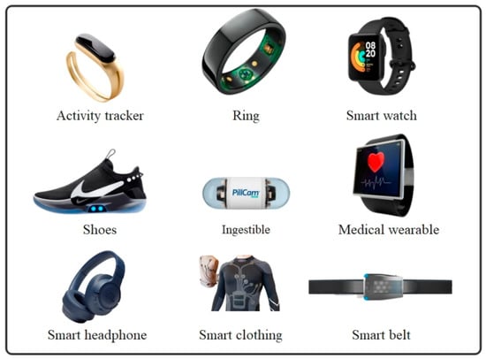 In this study, we focus on wearable sensors because of their universal applicability in IoHT applications. Wearable sensors can be embedded in clothing, implanted in the body, or worn on the wrist. In smart healthcare, devices collect patients’ vitals and transmit them to calculation servers via wired or wireless network connections. Many wearable products have been focused on development in recent years [], such as smartwatches, wristbands, eyewear, headphones, earplugs, body straps, and devices worn on the hands and feet, as presented in Figure 1. In [,], the authors indicate feasible solutions to the application of wearable medical sensors by using varying smartphone sensors to detect anomaly data in healthcare areas.