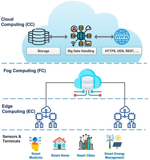 In recent years, to solve this problem, several computing models, such as fog computing (FC) [] and edge computing (EC) [], have been proposed. Figure 2 presents an all-in-one computing framework for IoT systems.