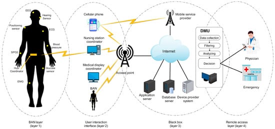 In smart healthcare, a WBAN is one of the most important core technologies. A WBAN is a set of intelligent IoT devices mounted on the human body to collect patient vitals and transmit this information to a data center for decision making. A WBAN works via wireless technology consisting of light and smart sensors attached to or implanted in the human body, measuring parameters such as heart rate, body temperature, blood glucose level, etc. These data are then visually provided to medical staff or caregivers to monitor and analyze the patient’s condition and devise appropriate treatment schemes [].