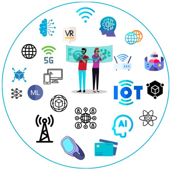 The definition was created by writer Neal Stephenson in his science fiction novel in 1992 []. In this novel, Stephenson describes the Metaverse as a vast virtual environment that coexists with the physical world, in which humans interact through digital avatars. A is a shared three-dimensional space in which users can perform all actions through virtual reality technologies such as AR, MR, and VR [], as presented in Figure 4.