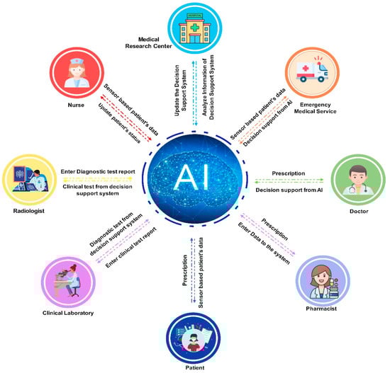Figure 6 shows that AI can be integrated with most healthcare systems to provide optimal solutions. AI can assist a patient from the moment they are admitted to the hospital through integration into emergency medical applications, process patient data, detect serious illnesses, automatically identify complex samples, and analyze complete human and patient molecular data in a clinical setting. AI can assist doctors and medical staff through highly accurate clinical reports and provide many other decision-support tools. AI effectively supports optimal treatment decision making for patients. Recent studies demonstrate that AI strongly assists in detecting cancer at an early stage.