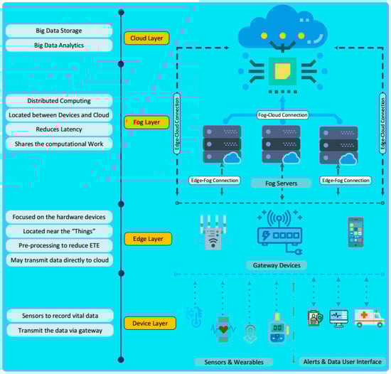 In recent decades, electronic health information systems (e-health) have focused on developing and achieving many positive results. In the traditional architecture of e-health systems, computing, processing, and storage are located in the cloud. Its robustness, reliability, and powerful computing capacity make cloud computing (CC) the computing technology of the future [,]. Although cloud computing has outstanding advantages, a significant limitation of CC is its high service response time. As a result, it is impossible to use in real-time healthcare applications. In recent times, to solve this problem, the integration of IoT technology and fog computing (FC) solutions [] with edge computing (EC) [] has been proposed.