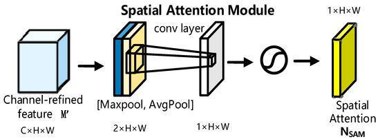 In Equation (4), is the sigmoid activation function, and represents the convolution operation. The size of the convolution kernel in Equation (4) is 7 × 7. In Equation (3), MaxPool is the maximum pooling, and AvgPool is the average pooling.