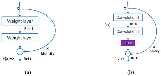 The integration of residual blocks of the attention mechanism necessitates the inclusion of the attention mechanism in the ResNet residual blocks; Figure 4b displays the ResNet-CBAM residual blocks. To eliminate duplicate information and highlight the significant features of the intermediate layers, the CBAM attention mechanism is added to the end structure of each base residual block, and the outcome of the attention is added to the input, thus producing a new feature map. Due to the fact that different layers of the ResNet model use different base residual blocks, the residual base blocks of the attention mechanism are likewise distinct, and this research primarily uses the residual attention module created by the ResNet-18 base residual blocks.