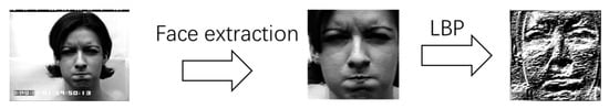 LBP is one of the most generally used texture pattern descriptors for examining local grain features and is regarded as one of the best methods for texture processing, which is widely employed in image processing. The LBP feature extraction is shown in Figure 6. LBP offers the advantages of grayscale invariance and rotation invariance for illumination-induced changes, making it excellent for extracting texture information of varying sizes and capable of resolving issues such as occlusion, rotation imbalance, and illumination-induced changes. In FER, LBP assists in the recognition of facial expression-related characteristics, such as the eyes, eyebrows, nose, and mouth. Using LBP can successfully extract texture information from a picture and detect minute changes in the face, hence enhancing the performance of a facial expression recognition network. In this study, the LBP operator is specified as a 3 × 3 neighborhood, and the center pixel is utilized as a threshold to compare the grayscale value of the center pixel to those of its eight nearby pixels. The code value is 1 if the bordering pixel value is larger than or equal to the central pixel value; otherwise, it is 0. The resulting 8-bit binary number is encoded, its binary code is translated to a decimal value, and its decimal value is placed as the center pixel value. In the experiments, the improved LBP operator proposed by Ojala et al. [11], namely the circular LBP algorithm, is utilized because the original LBP algorithm can only cover a very small range of 3 × 3 neighborhoods and cannot be applied to the requirement of extracting features of different sizes and frequencies of textures. The circular LBP algorithm expands the 3 × 3 neighborhood to an arbitrary neighborhood and permits the presence of any pair of pixels in a circular neighborhood with a radius. Its definition is given by Equation (7):