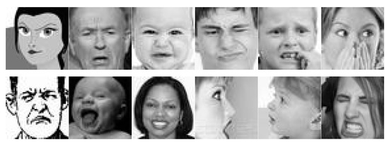 FERPLUS Dataset [8]: The FERLPUS dataset is expanded from the original FER2013 dataset. Because of the inaccurate annotation of FER2013, Barsoum et al. [8] used crowdsourcing to improve the accuracy of the annotation, and each image from the FERPLUS dataset has 10 labels. In addition to the seven basic expressions in FER2013, contempt, unknown, and non-human face were added to the tags. According to the voting results, we removed the votes that were less than 1 to remove some of the noise. Then we classified the images that received more than half of the total remaining votes on a certain category as that category and removed the unknown and non-face classes. The processed dataset contains 25,060 training pictures, 3153 test images, and 3199 validation images. The sample images of the FERPLUS dataset are shown in Figure 9.