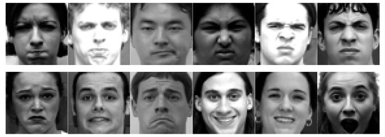 - Lyons, M.; Akamatsu, S.; Kamachi, M.; Gyoba, J. Coding Facial Expressions with Gabor Wavelets. In Proceedings of the Third IEEE International Conference on Automatic Face and Gesture Recognition, Nara, Japan, 14–16 April 1998; pp. 200–205. [Google Scholar]