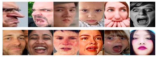 Facial expressions are one of the most significant indicators of emotional states and intentions in regular human communication [1]. In recent years, facial expression recognition (FER) has played an increasingly vital role in human–computer interaction, intelligent security, multimedia entertainment, autonomous driving, service robots, behavioral psychology, healthcare, and driver tiredness monitoring, among other sectors. Thus, facial expression recognition has become one of the most active areas of study nowadays. Depending on the context in which the datasets are obtained, two methodologies have been developed: FER under controlled settings in the laboratory and FER in the wild. In controlled laboratory contexts, such as CK+ [2], JAFFE [3], MMI [4], and Oulu-CASIA [5], the face pictures are frontal and almost unobstructed, where FER accuracy has achieved amazing results. In the wild facial expressions datasets, such as RAF-DB [6], EmotioNet [7], FERPLUS [8], and AffectNet [9], the recognition accuracy of images collected from the real world in practical applications cannot obtain good results due to occlusions, lighting, pose changes, age, and low-quality facial images. In this context, FER continues to face enormous obstacles.