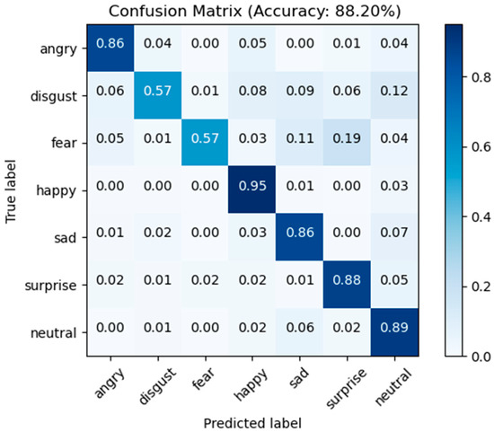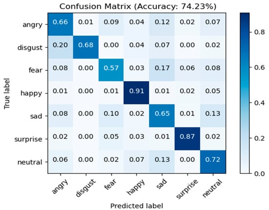 FER2013 Comparison: The model presented in this paper is compared to several state-of-the-art methods in Table 1 for the FER2013 dataset. The experimental results demonstrate that the method proposed in this paper achieved a recognition rate of 74.23%, which is superior to the most recent methods compared in the table. The method presented in this paper improved recognition rates by 1.83% compared to ResNet [34], by 0.97% compared to the most recent method, Landmark-guided GCNN [35], and by 1.6 percent compared to the ResNet18 baseline network. The confusion matrix of FER2013 on the test set is depicted in Figure 12, where the horizontal coordinates represent the predicted labels, and the vertical coordinates represent the true labels. The accuracy on the diagonal line represents the proportion of correct predictions for each category in Figure 12. The highest recognition rates are 91% and 87% for happy and surprised, while the recognition rates for anger, fear, and sadness are 66%, 57%, and 65%, respectively, due to frequent confusion between these three categories. In addition, the confusion matrix reveals that disgust emotions are frequently misclassified as anger, possibly due to the small number of disgust samples in the original training dataset. In general, the overall recognition rate of the FER2013 dataset is low, primarily because the images of the FER2013 dataset are of low resolution and contain a significant amount of noise.