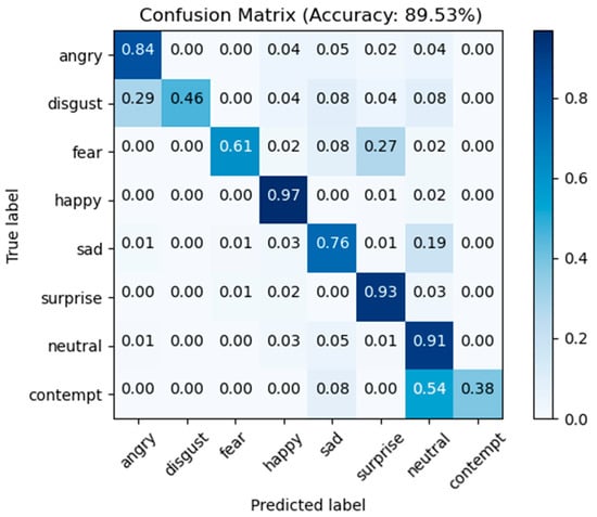 FERPLUS Comparison: Table 2 displays the outcomes of a comparison of this paper’s approach using the FERPLUS dataset with other state-of-the-art techniques. We compared our model with other CNN methods, such as ResNet+VGG [42], SENet [43], SHCNN [37], RAN [19], VTFF [44], ADC-Net [45], and the latest methods CERN [46] and A-MoblieNet [47]. The method used in this paper achieved an accuracy of 89.53% using the FERPLUS dataset without the use of pre-trained models, outperforming some of the advanced models in Table 2. Among them, SCN-ResNet18, RAN, and VTFF all utilized ResNet-18 trained using the MS-Celeb-1M face recognition dataset. Compared with the latest methods, CERN and A-MoblieNet, the method used in this paper comparatively improved recognition rates by 1.36% and 1.42%, respectively. Compared with the baseline network ResNet18, the method of this paper improved the recognition rate by 2.69%. The confusion matrix of the model in this paper on the test set is shown in Figure 13. According to the results displayed in Figure 13, the highest recognition accuracy, 97%, is for happy, followed by surprised, neutral, and angry, which are 93%, 91%, and 84%, respectively. The recognition accuracy of contempt is the lowest (38%). We assumed the main reason for this is the insufficient number of samples used for training, making it indistinguishable from neutral. As a result, 54% of contempt is wrongly classified as neutral.