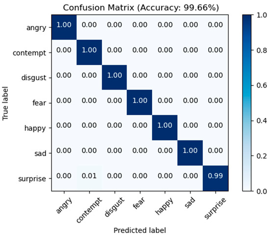 CK+ Comparison: For the CK+ dataset, we compared our method with VGG Net+LSTM [48], SLPM [49], Pre-trained CNN [50], GA-SVM [51], PyFER [52], AC-GAN [53], CNN+SAE [54], and CMCNN [55] methods. The comparison results are shown in Table 3, in which our method achieved 99.66% accuracy using the CK+ dataset. The confusion matrix is depicted in Figure 14 details the categorization results for each of the seven categories of expressions, with the diagonal entries representing the average recognition rate for each category. As demonstrated, the accuracy rates for anger, contempt, disgust, fear, happy, and sad expressions approached one hundred percent, and only a small fraction of astonished expressions were mistakenly identified as disdain expressions. Table 3 demonstrates that the overall recognition accuracy of the CK+ dataset is greater when compared to the other datasets. This is mostly because the CK+ dataset has superior labeling, was gathered under controlled laboratory circumstances, and the image quality is quite high.